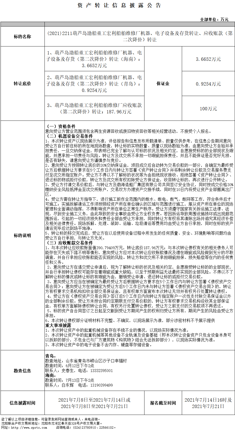 葫蘆島渤船重工宏利船舶維修廠機器、電子設(shè)備及存貨(第二次降價)轉(zhuǎn)讓(海南)