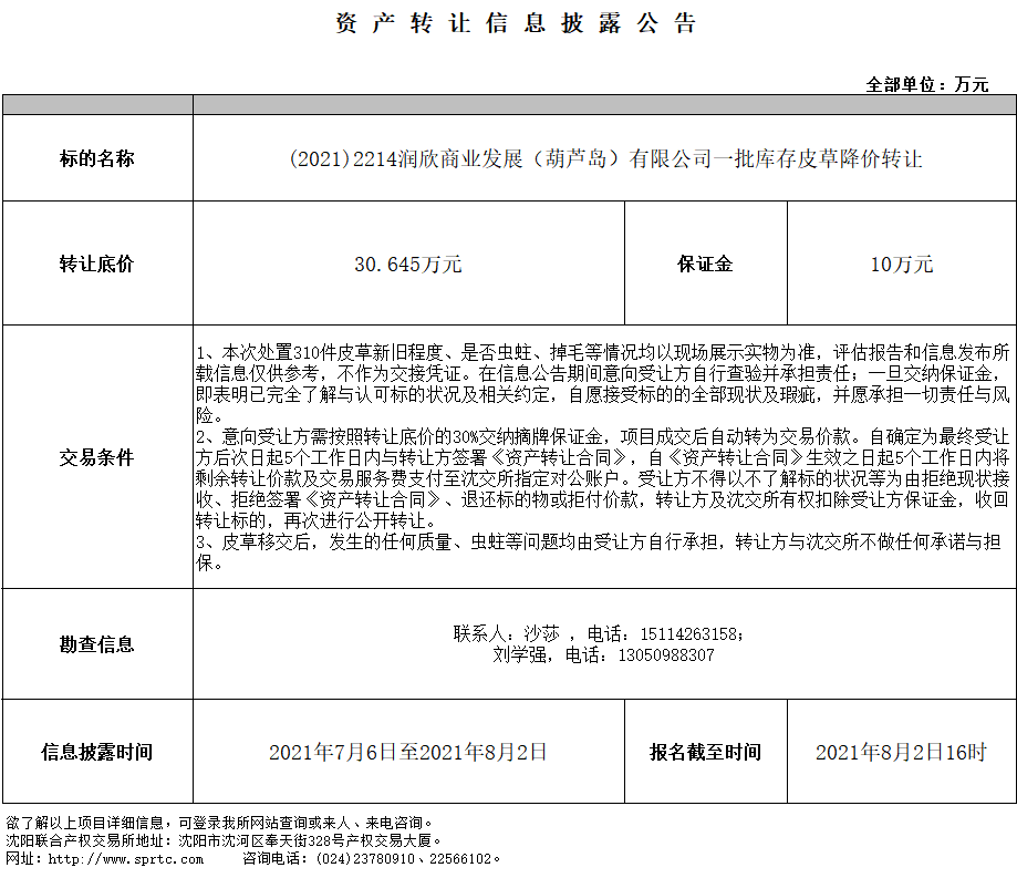潤欣商業(yè)發(fā)展(葫蘆島)有限公司一批庫存皮草降價(jià)轉(zhuǎn)讓