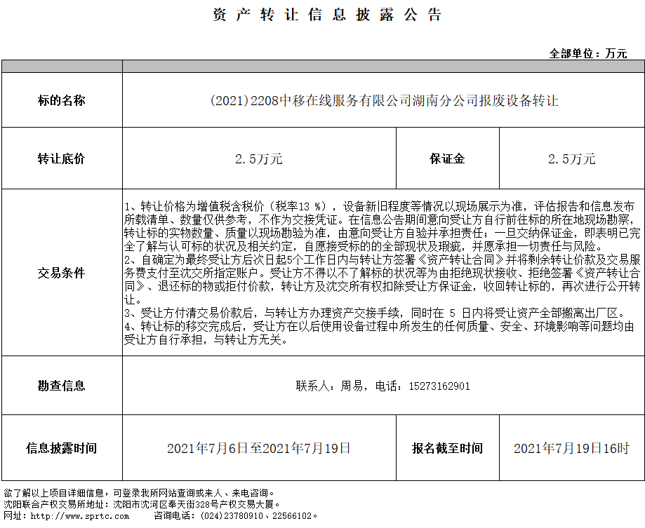 中移在線服務(wù)有限公司湖南分公司報(bào)廢設(shè)備轉(zhuǎn)讓
