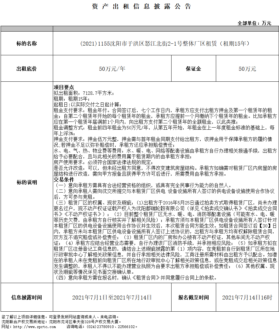 沈陽市于洪區(qū)怒江北街2-1號(hào)整體廠區(qū)租賃(租期15年)