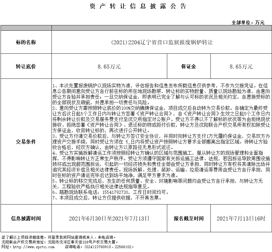 (2021)2204遼寧省營口監(jiān)獄報廢鍋爐轉讓