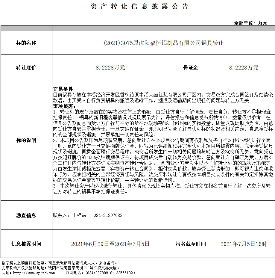 (2021)3075原沈陽福恒鋁制品有限公司鍋具轉(zhuǎn)讓