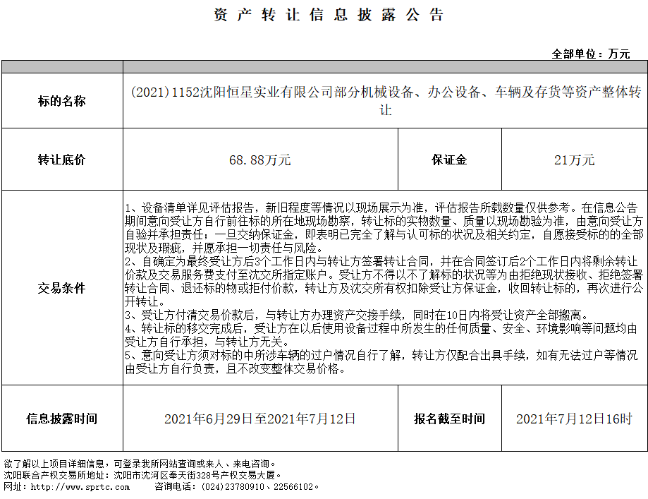 沈陽恒星實(shí)業(yè)有限公司部分機(jī)械設(shè)備、辦公設(shè)備、車輛及存貨等資產(chǎn)整體轉(zhuǎn)讓