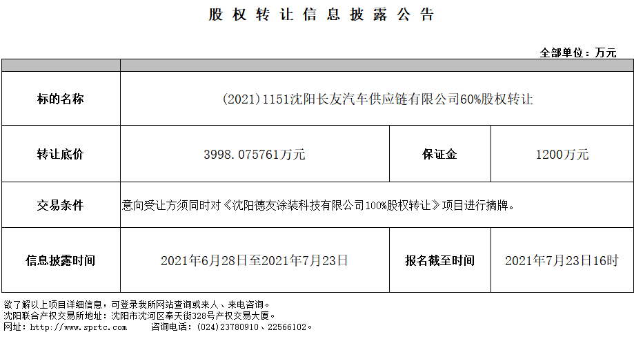 沈陽長友汽車供應鏈有限公司60%股權轉(zhuǎn)讓
