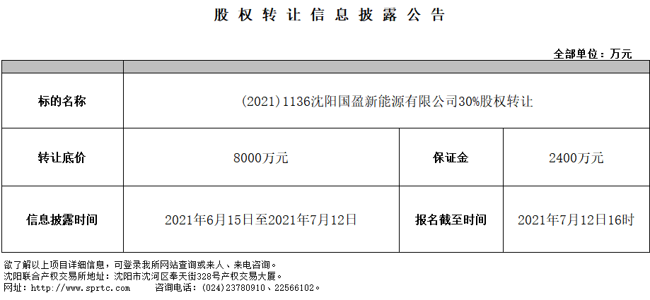 沈陽國盈新能源有限公司30%股權轉讓