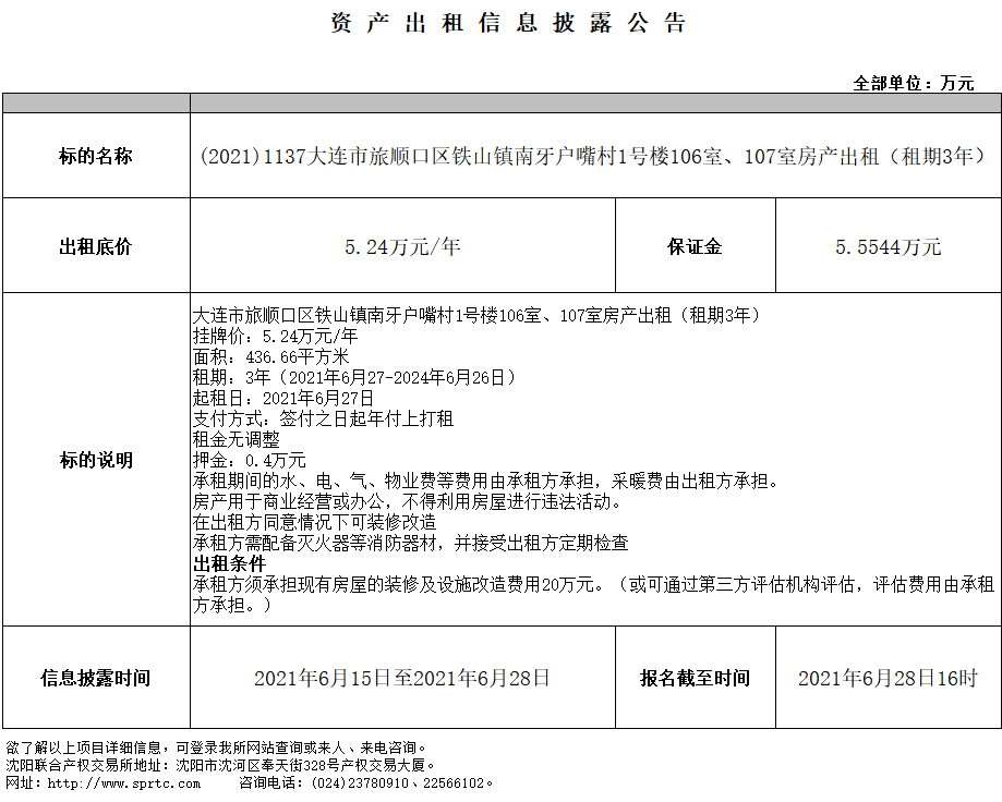 大連市旅順口區(qū)鐵山鎮(zhèn)南牙戶嘴村1號樓106室、107室房產(chǎn)出租(租期3年)