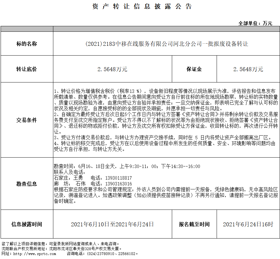 中移在線服務(wù)有限公司河北分公司一批報廢設(shè)備轉(zhuǎn)讓