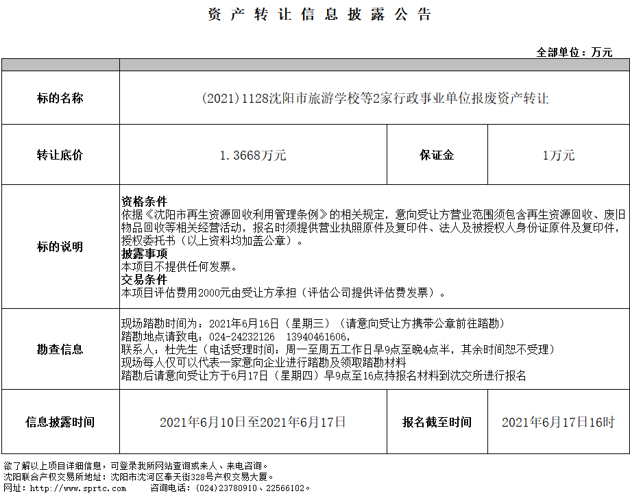 沈陽市旅游學校等2家行政事業(yè)單位報廢資產(chǎn)轉讓