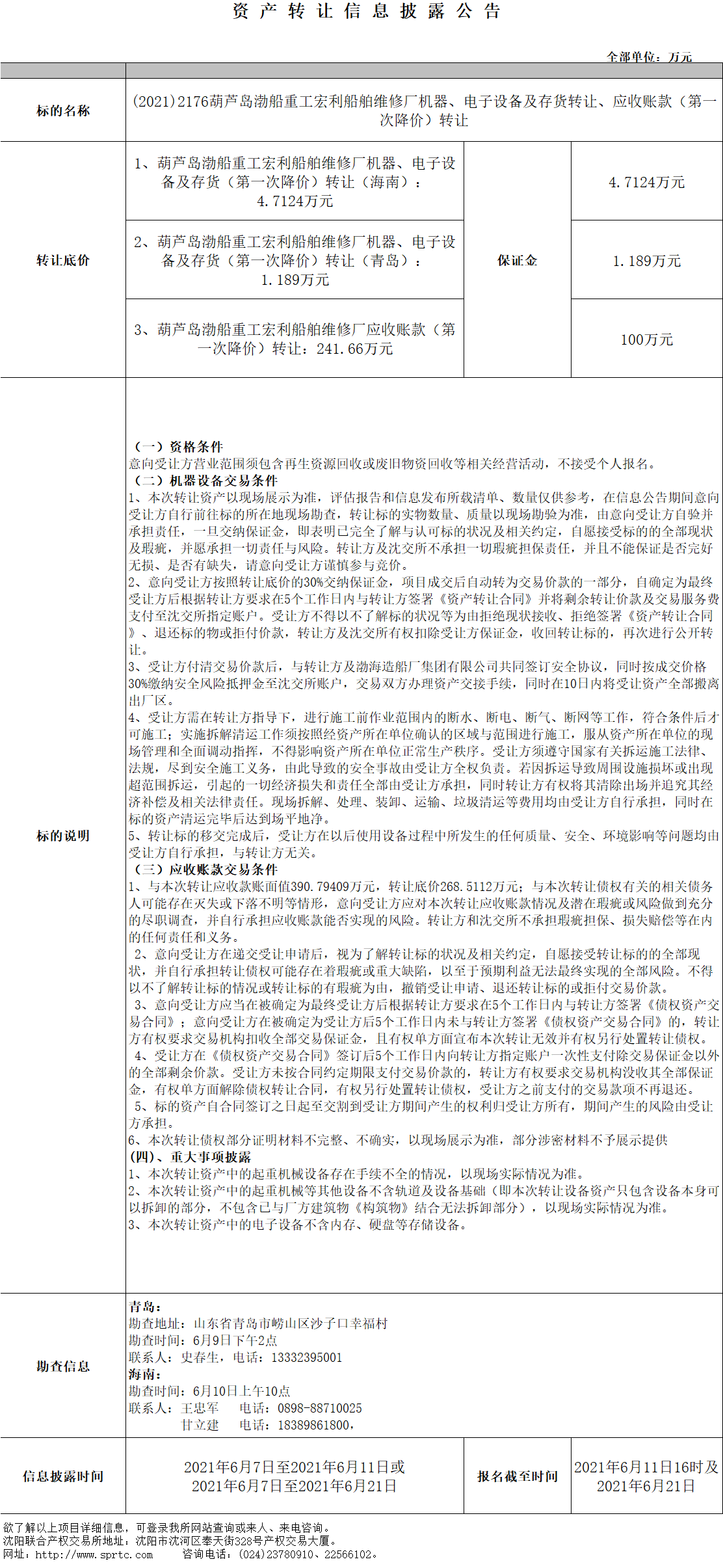 葫蘆島渤船重工宏利船舶維修廠機器、電子設(shè)備及存貨(第一次降價)轉(zhuǎn)讓(青島)