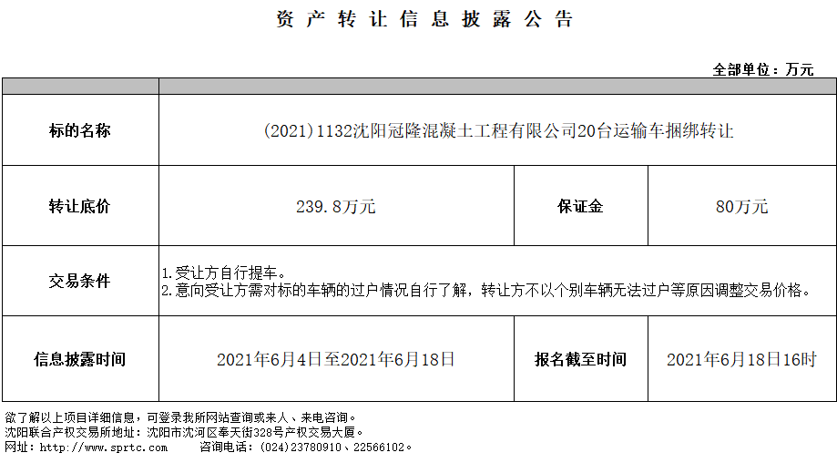 沈陽冠隆混凝土工程有限公司20臺運輸車輛捆綁轉(zhuǎn)讓