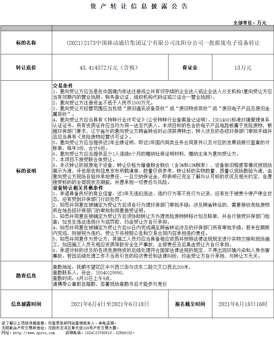 中國(guó)移動(dòng)通信集團(tuán)遼寧有限公司沈陽(yáng)分公司一批報(bào)廢電子設(shè)備轉(zhuǎn)讓
