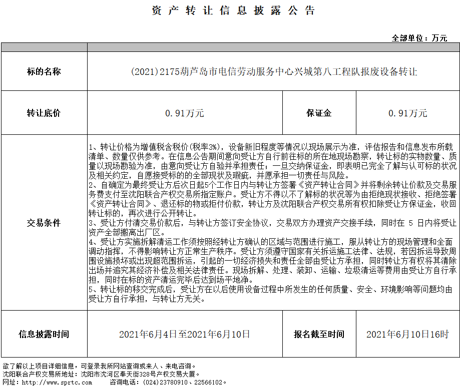 葫蘆島市電信勞動服務中心興城第八工程隊報廢設備轉讓