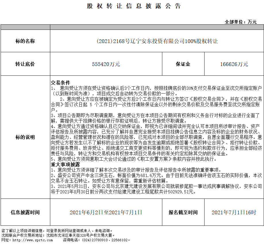 (2021)2168號遼寧安東投資有限公司100%股權轉讓