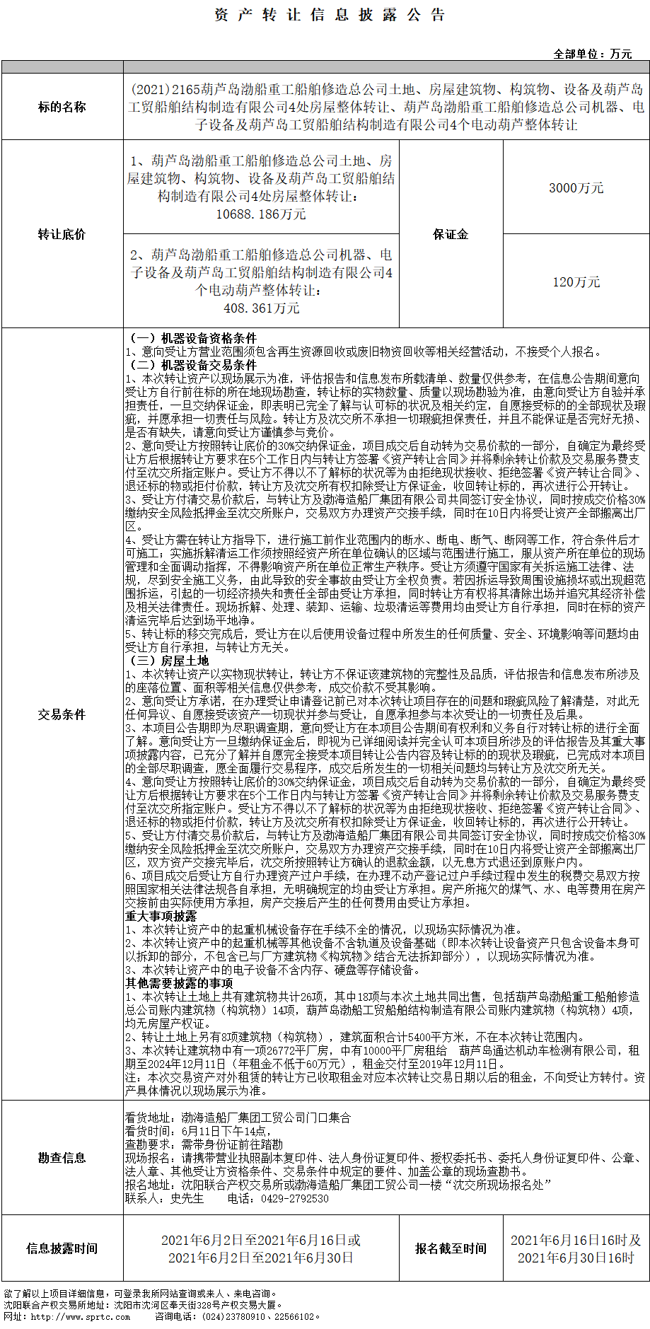 葫蘆島渤船重工船舶修造總公司土地、房屋建筑物、構(gòu)筑物、設(shè)備及葫蘆島工貿(mào)船舶結(jié)構(gòu)制造有限公司4處房屋整體轉(zhuǎn)讓