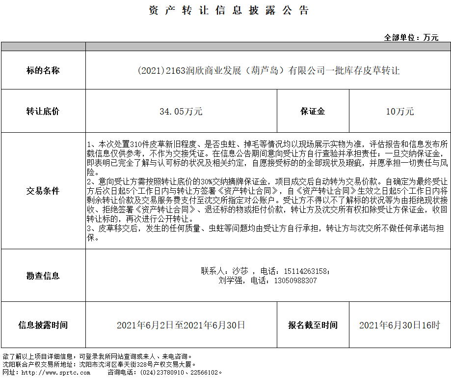 潤(rùn)欣商業(yè)發(fā)展(葫蘆島)有限公司一批庫存皮草轉(zhuǎn)讓