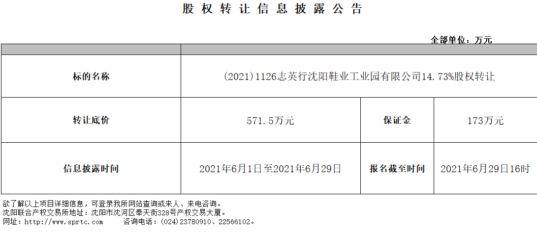 項(xiàng)目鏈接:志英行沈陽(yáng)鞋業(yè)工業(yè)園有限公司14.73%股權(quán)轉(zhuǎn)讓
