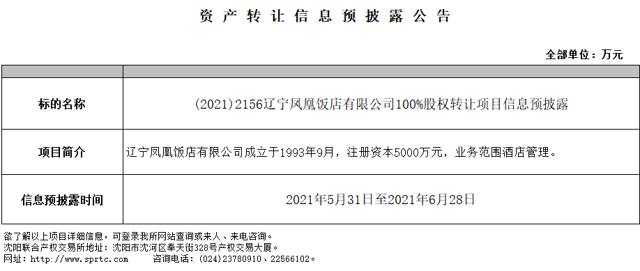 遼寧鳳凰飯店有限公司100%股權(quán)轉(zhuǎn)讓信息預(yù)披露