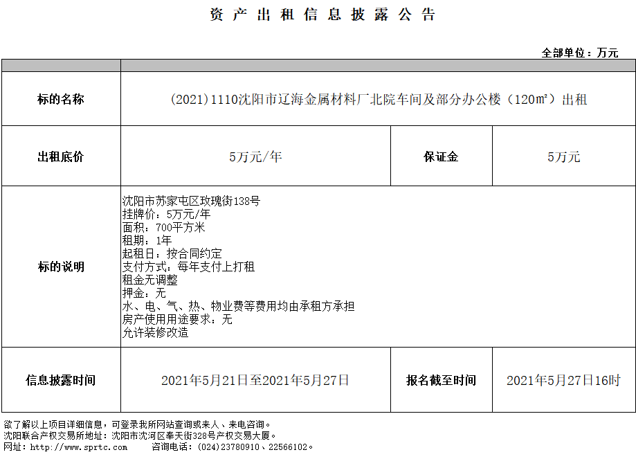 沈陽市遼海金屬材料廠北院車間及部分辦公樓(120㎡)出租