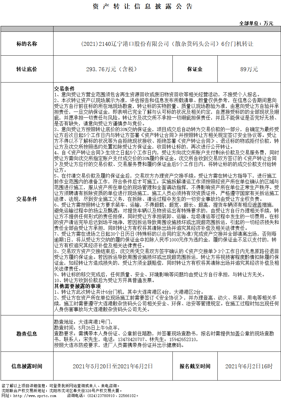 遼寧港口股份有限公司(散雜貨碼頭公司)6臺(tái)門機(jī)轉(zhuǎn)讓