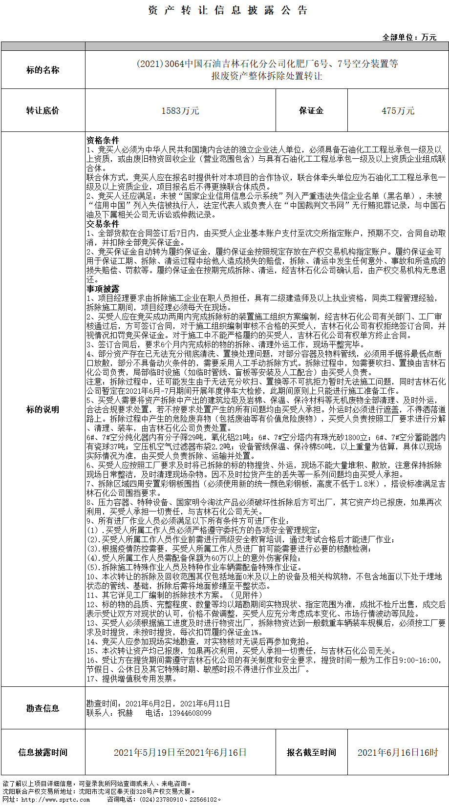 中國(guó)石油吉林石化分公司化肥廠6號(hào)、7號(hào)空分裝置等報(bào)廢資產(chǎn)整體拆除處置項(xiàng)目