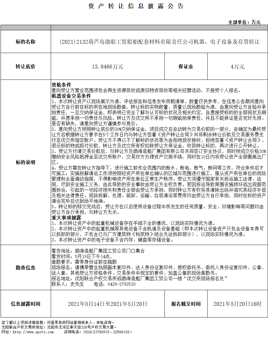 葫蘆島渤船工貿(mào)船舶配套材料有限責(zé)任公司機(jī)器、電子設(shè)備及存貨轉(zhuǎn)讓