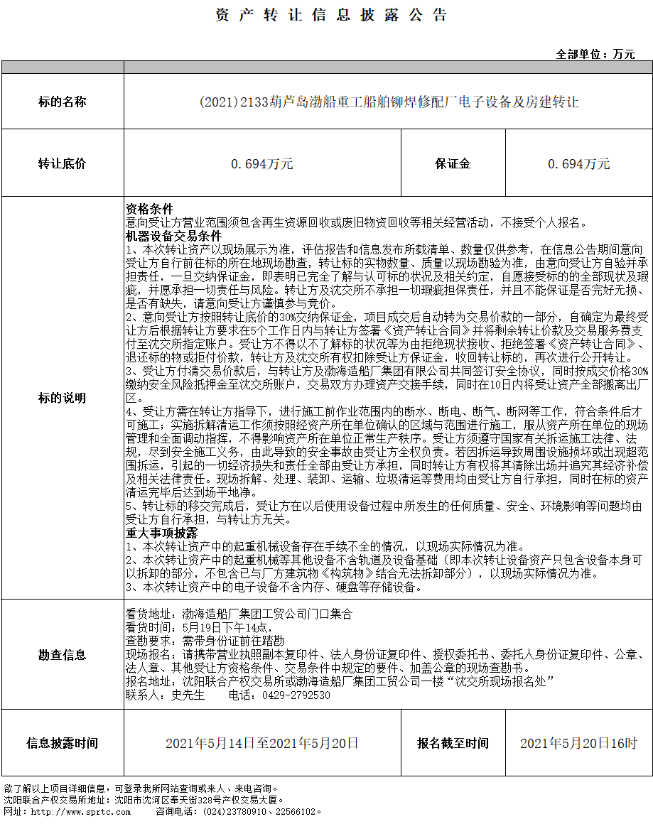 葫蘆島渤船重工船舶鉚焊修配廠(chǎng)電子設(shè)備及房建轉(zhuǎn)讓
