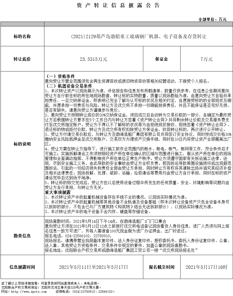 葫蘆島渤船重工玻璃鋼廠機(jī)器、電子設(shè)備及存貨轉(zhuǎn)讓