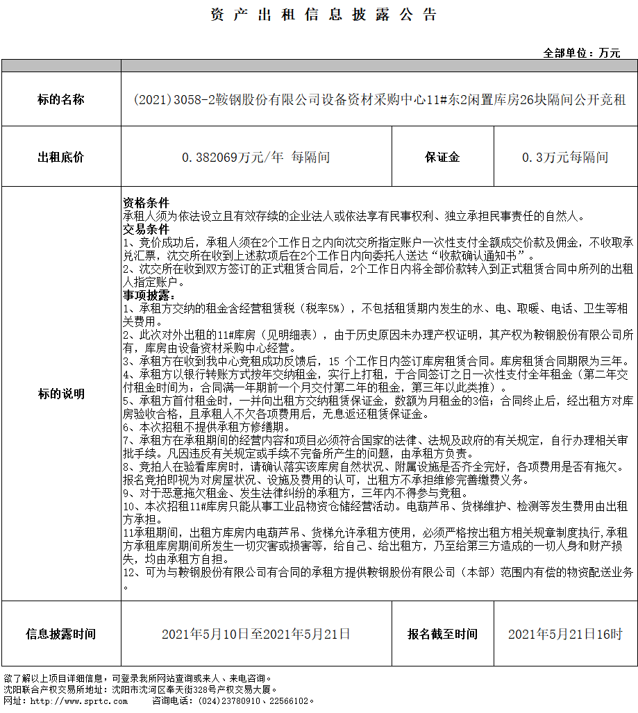 鞍鋼股份有限公司設(shè)備資材采購中心11號庫東2-26號出租