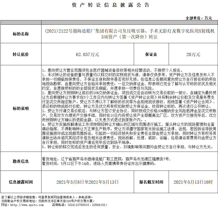 渤海造船廠集團有限公司負壓吸引器、手術(shù)無影燈及數(shù)字化醫(yī)用X射線機3項資產(chǎn)(第一次降價)轉(zhuǎn)讓