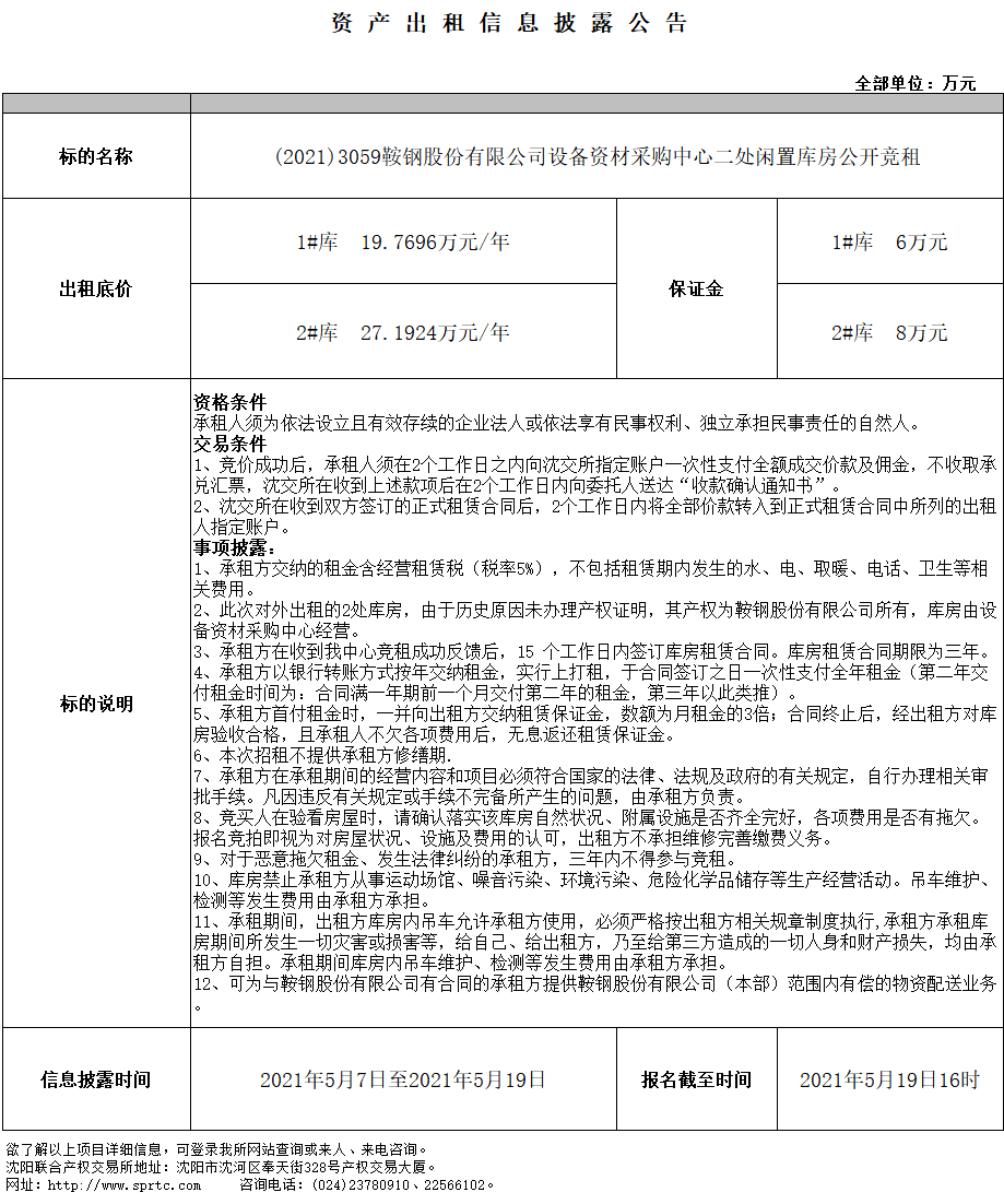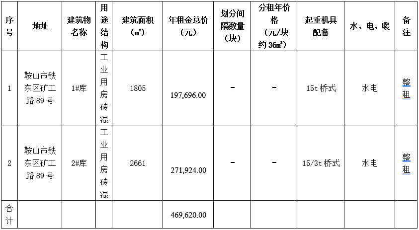 (2021)3059鞍鋼股份有限公司設(shè)備資材采購(gòu)中心二處閑置庫(kù)房公開(kāi)競(jìng)租