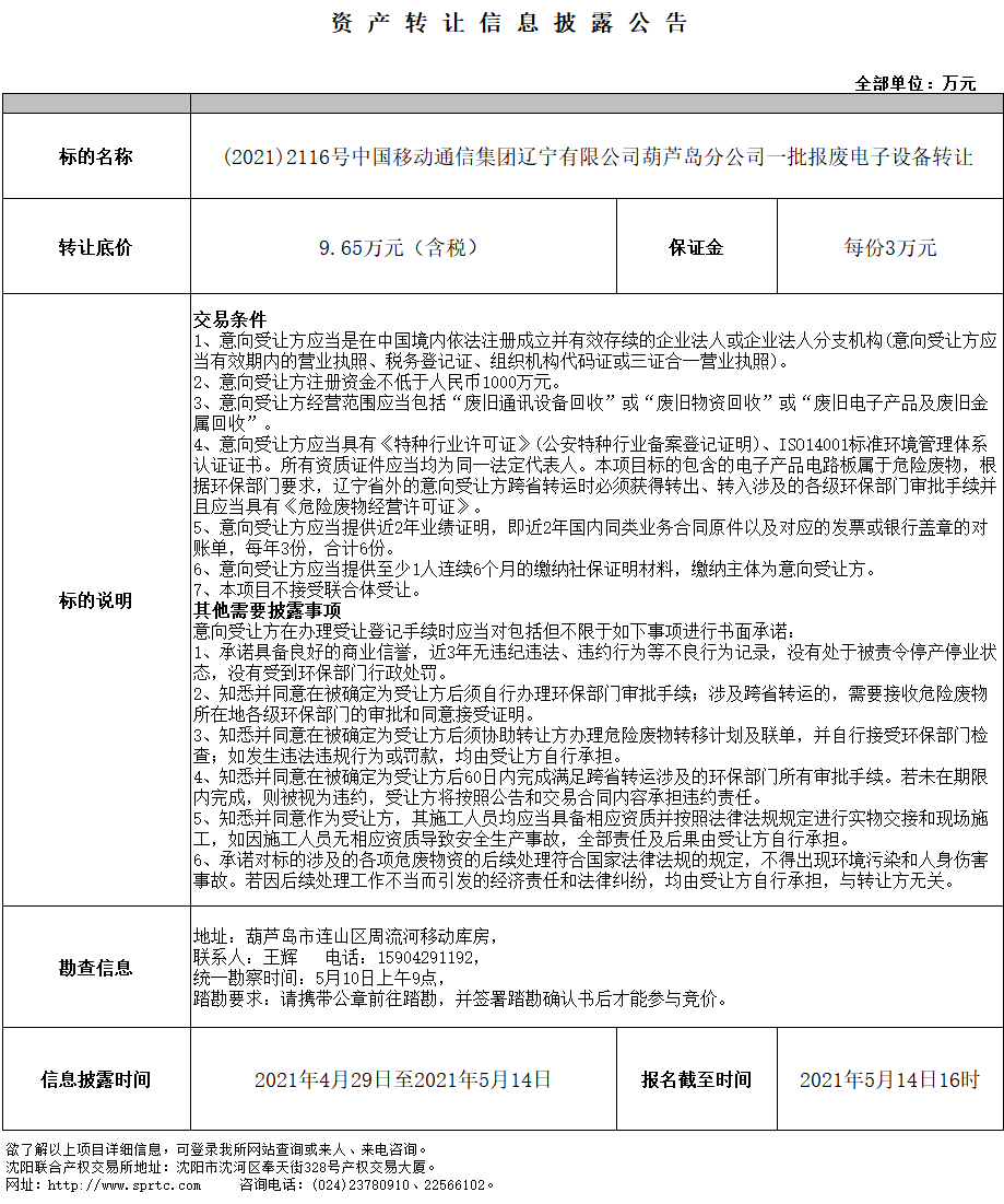 中國移動通信集團遼寧有限公司葫蘆島分公司一批報廢電子設(shè)備轉(zhuǎn)讓