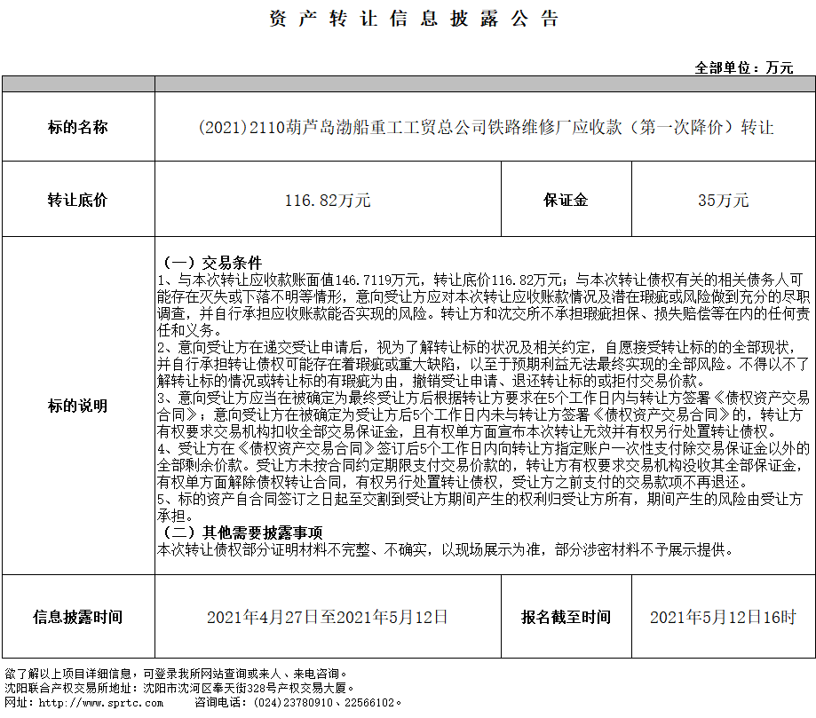 葫蘆島渤船工貿(mào)鐵路維修廠應(yīng)收款(第一次降價(jià))轉(zhuǎn)讓