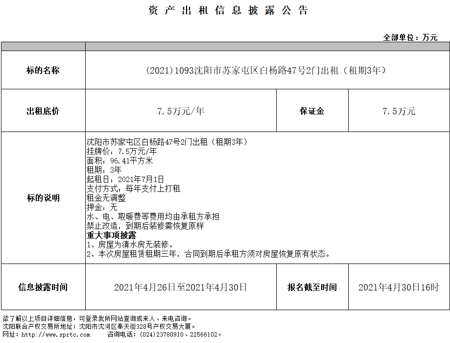 沈陽市蘇家屯區(qū)白楊路47號(hào)2門出租(租期3年)