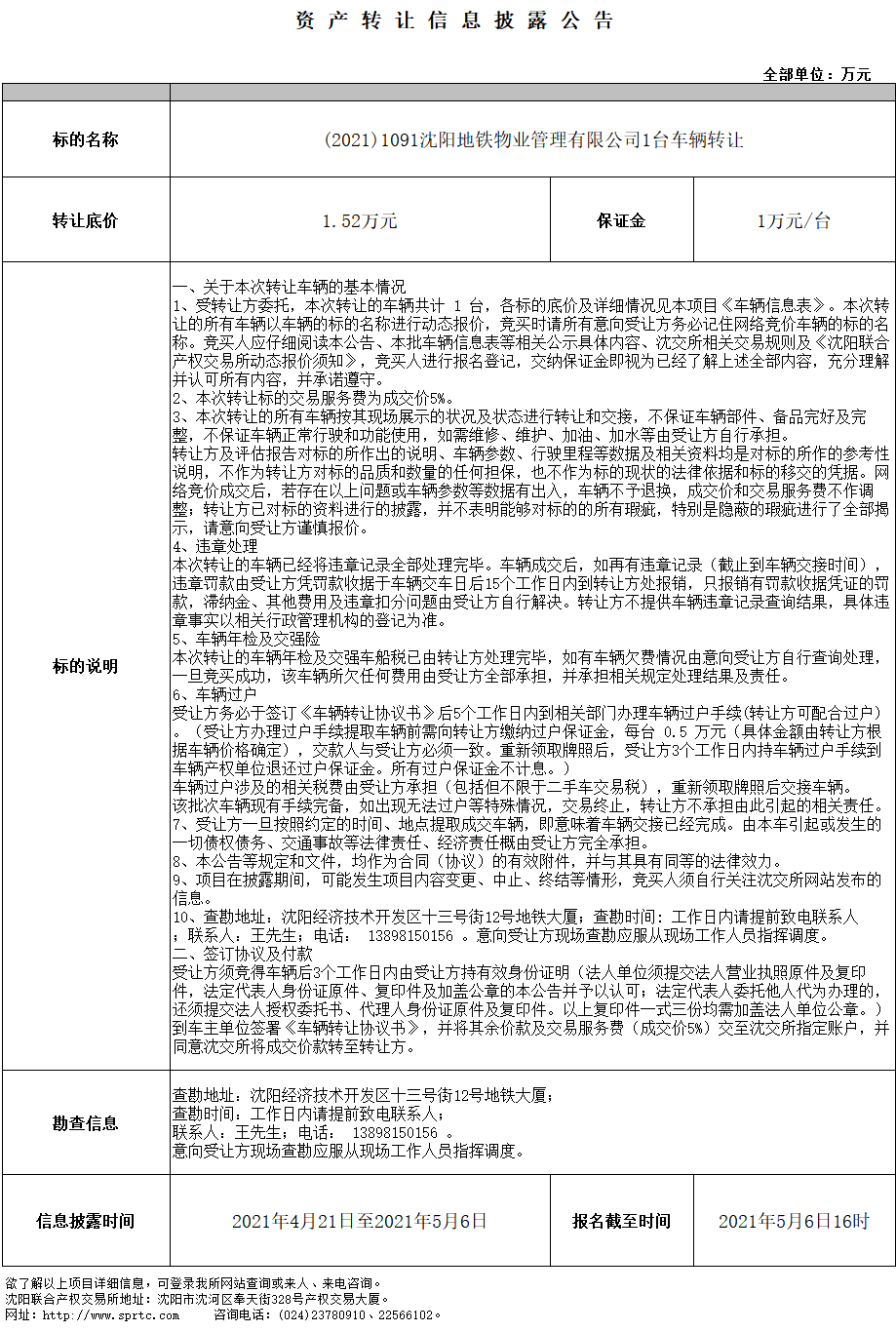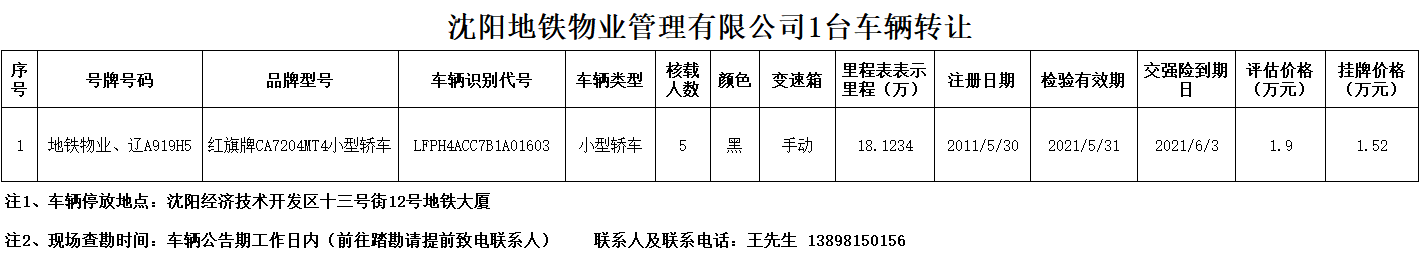 沈陽地鐵物業(yè)管理有限公司1臺車輛轉(zhuǎn)讓