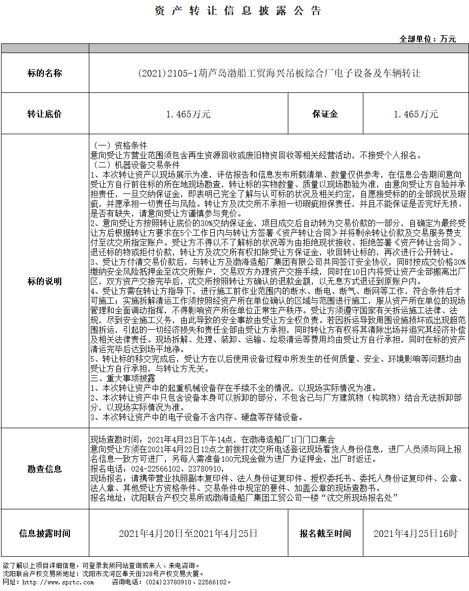 葫蘆島渤船工貿(mào)海興吊板綜合廠電子設(shè)備及車輛轉(zhuǎn)讓