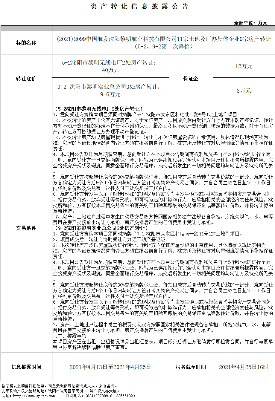 9-2 沈陽市黎明實(shí)業(yè)總公司3處房產(chǎn)(第一次降價(jià))轉(zhuǎn)讓