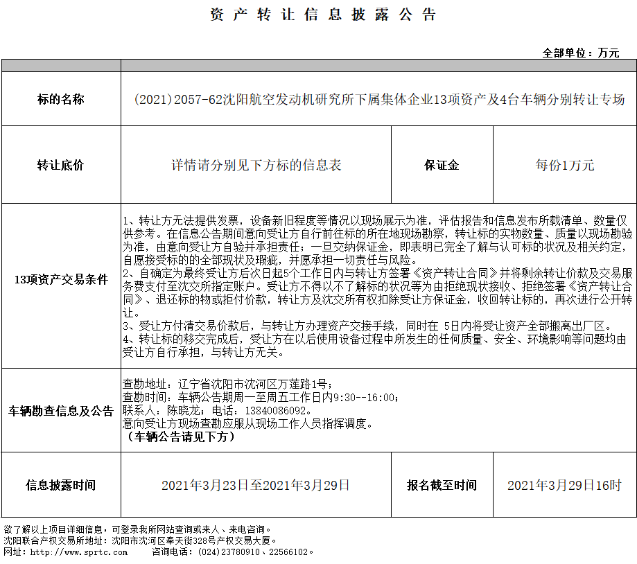 1、受轉(zhuǎn)讓方委托,本次轉(zhuǎn)讓的車(chē)輛共計(jì) 4臺(tái),各標(biāo)的底價(jià)及詳細(xì)情況見(jiàn)本項(xiàng)目《車(chē)輛信息表》。本次轉(zhuǎn)讓的所有車(chē)輛以車(chē)輛的標(biāo)的名稱(chēng)進(jìn)行專(zhuān)場(chǎng)動(dòng)態(tài)報(bào)價(jià),競(jìng)買(mǎi)時(shí)請(qǐng)所有意向受讓方務(wù)必記住網(wǎng)絡(luò)競(jìng)價(jià)車(chē)輛的標(biāo)的名稱(chēng)。競(jìng)買(mǎi)人應(yīng)仔細(xì)閱讀本公告、本批車(chē)輛信息表等相關(guān)公示具體內(nèi)容、沈交所相關(guān)交易規(guī)則及《沈陽(yáng)聯(lián)合產(chǎn)權(quán)交易所動(dòng)態(tài)報(bào)價(jià)須知》,競(jìng)買(mǎi)人通過(guò)互聯(lián)網(wǎng)進(jìn)行報(bào)名登記,交納保證金即視為已經(jīng)了解上述全部?jī)?nèi)容,充分理解并認(rèn)可所有內(nèi)容,并承諾遵守。