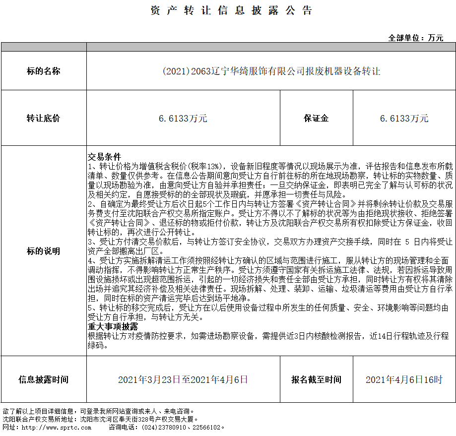 遼寧華綺服飾有限公司報(bào)廢機(jī)器設(shè)備轉(zhuǎn)讓