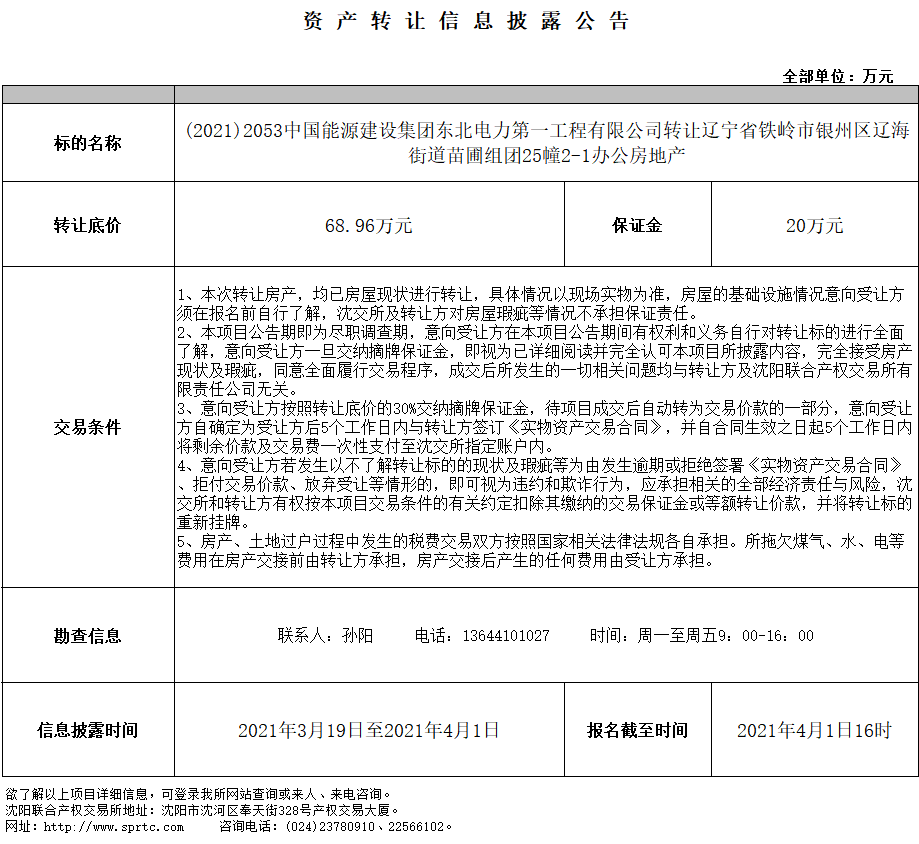 中國能源建設(shè)集團(tuán)東北電力第一工程有限公司轉(zhuǎn)讓 遼寧省鐵嶺市銀州區(qū)遼海街道苗圃組團(tuán)25幢2-1辦公房地產(chǎn)
