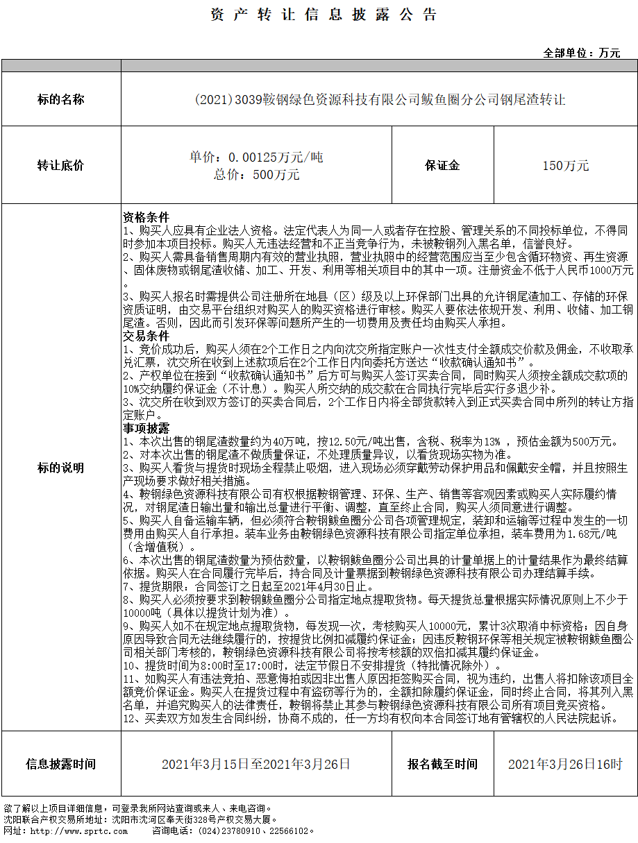 鞍鋼綠色資源科技有限公司鲅魚圈分公司鋼尾渣轉(zhuǎn)讓