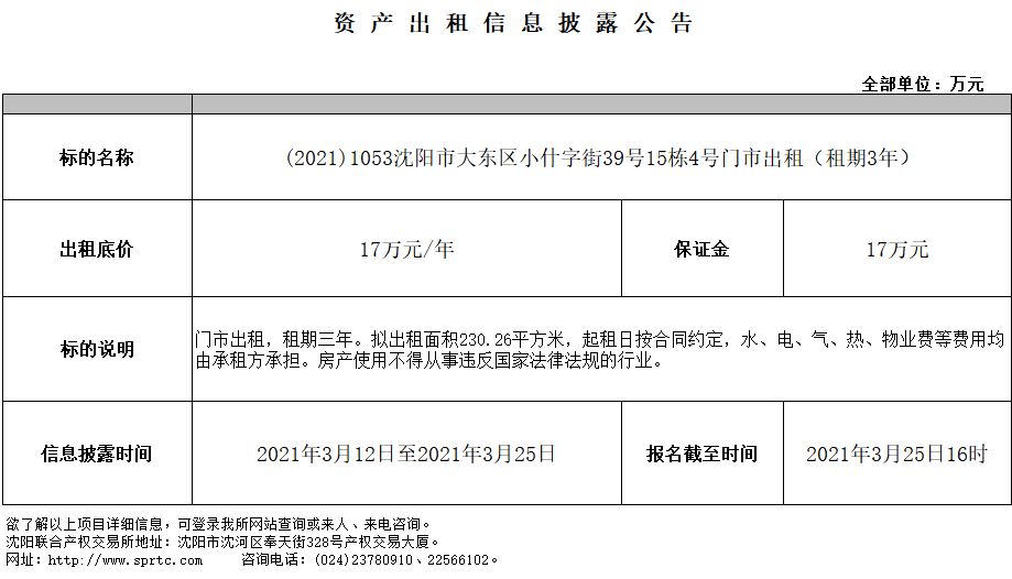 沈陽市大東區(qū)小什字街39號(hào)15棟4號(hào)門市出租(租期3年)