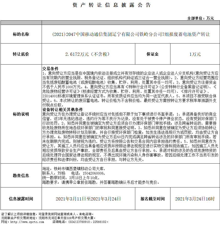 中國移動(dòng)通信集團(tuán)遼寧有限公司鐵嶺分公司7組報(bào)廢蓄電池 資產(chǎn)轉(zhuǎn)讓