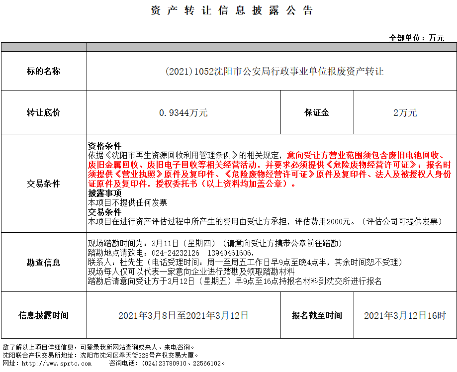 沈陽(yáng)市公安局行政事業(yè)單位報(bào)廢資產(chǎn)轉(zhuǎn)讓