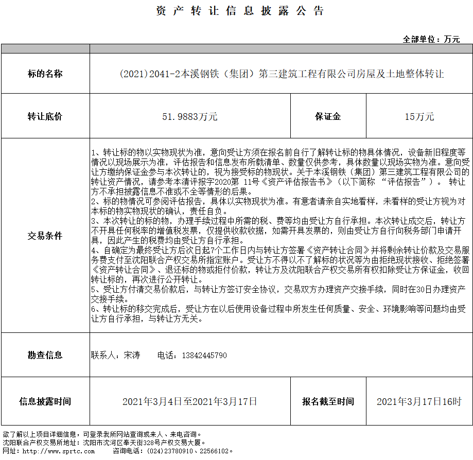 本溪鋼鐵(集團(tuán))第三建筑工程有限公司房屋及土地整體轉(zhuǎn)讓