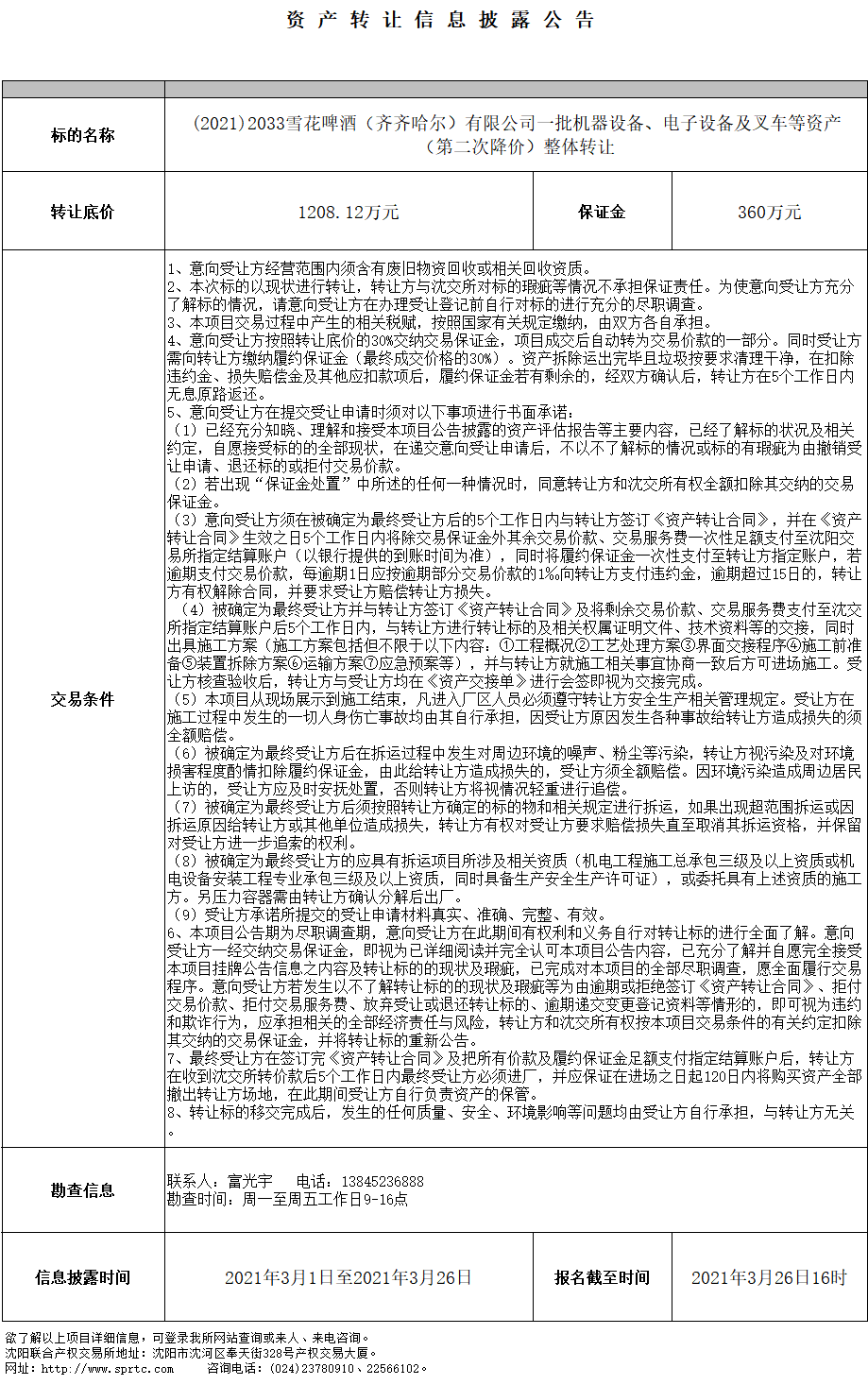 雪花啤酒(齊齊哈爾)有限公司一批機(jī)器設(shè)備、電子設(shè)備及叉車(chē)等資產(chǎn)(第二次降價(jià))整體轉(zhuǎn)讓