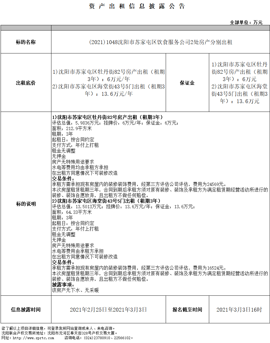 沈陽市蘇家屯區(qū)牡丹街82號房產(chǎn)出租(租期3年)