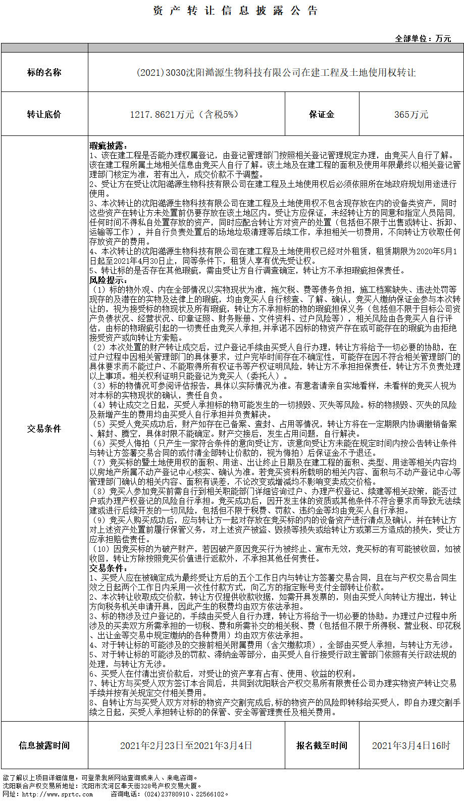 沈陽澔源生物科技有限公司在建工程及土地使用權(quán)轉(zhuǎn)讓第三次