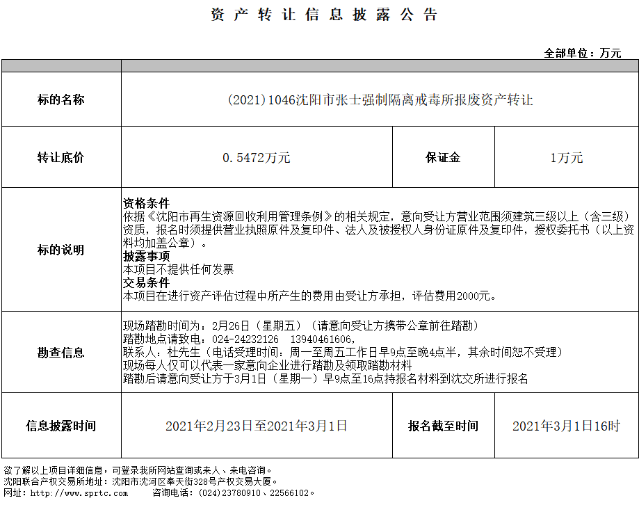 沈陽市張士強(qiáng)制戒毒所報(bào)廢資產(chǎn)轉(zhuǎn)讓