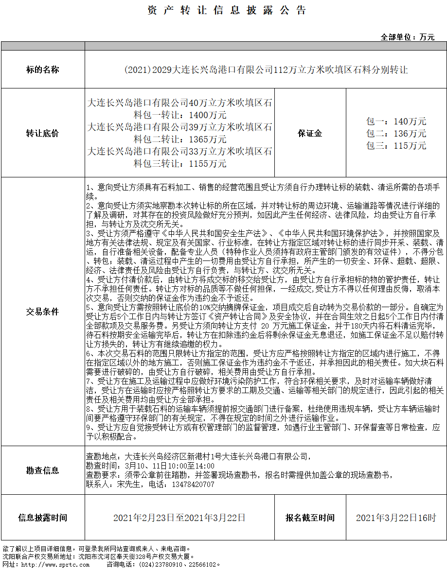 大連長興島港口有限公司33萬立方米吹填區(qū)石料包三轉(zhuǎn)讓