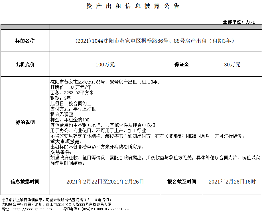 沈陽市蘇家屯區(qū)楓楊路86號、88號部分房產(chǎn)出租(租期3年)